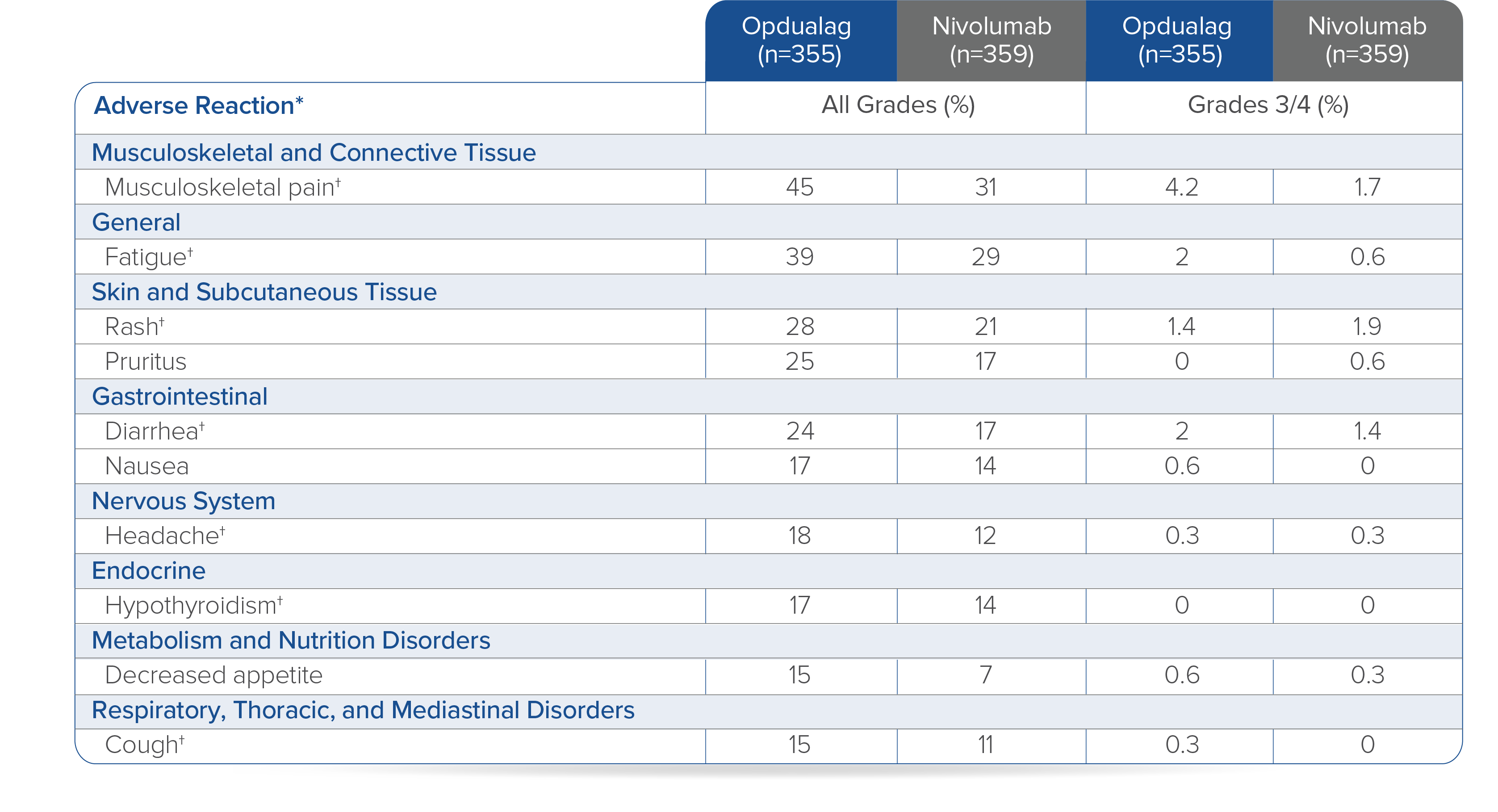 • OPDIVO can cause severe infusion-related reactions. Discontinue OPDIVO in patients with severe (Grade 3) or life-threatening (Grade 4) infusion-related reactions. Interrupt or slow the rate of infusion in patients with mild (Grade 1) or moderate (Grade 2) infusion-related reactions. In patients receiving OPDIVO monotherapy as a 60-minute infusion, infusion-related reactions occurred in 6.4% (127/1994) of patients. In a separate trial in which patients received OPDIVO monotherapy as a 60-minute infusion or a 30-minute infusion, infusion-related reactions occurred in 2.2% (8/368) and 2.7% (10/369) of patients, respectively. Additionally, 0.5% (2/368) and 1.4% (5/369) of patients, respectively, experienced adverse reactions within 48 hours of infusion that led to dose delay, permanent discontinuation or withholding of OPDIVO.