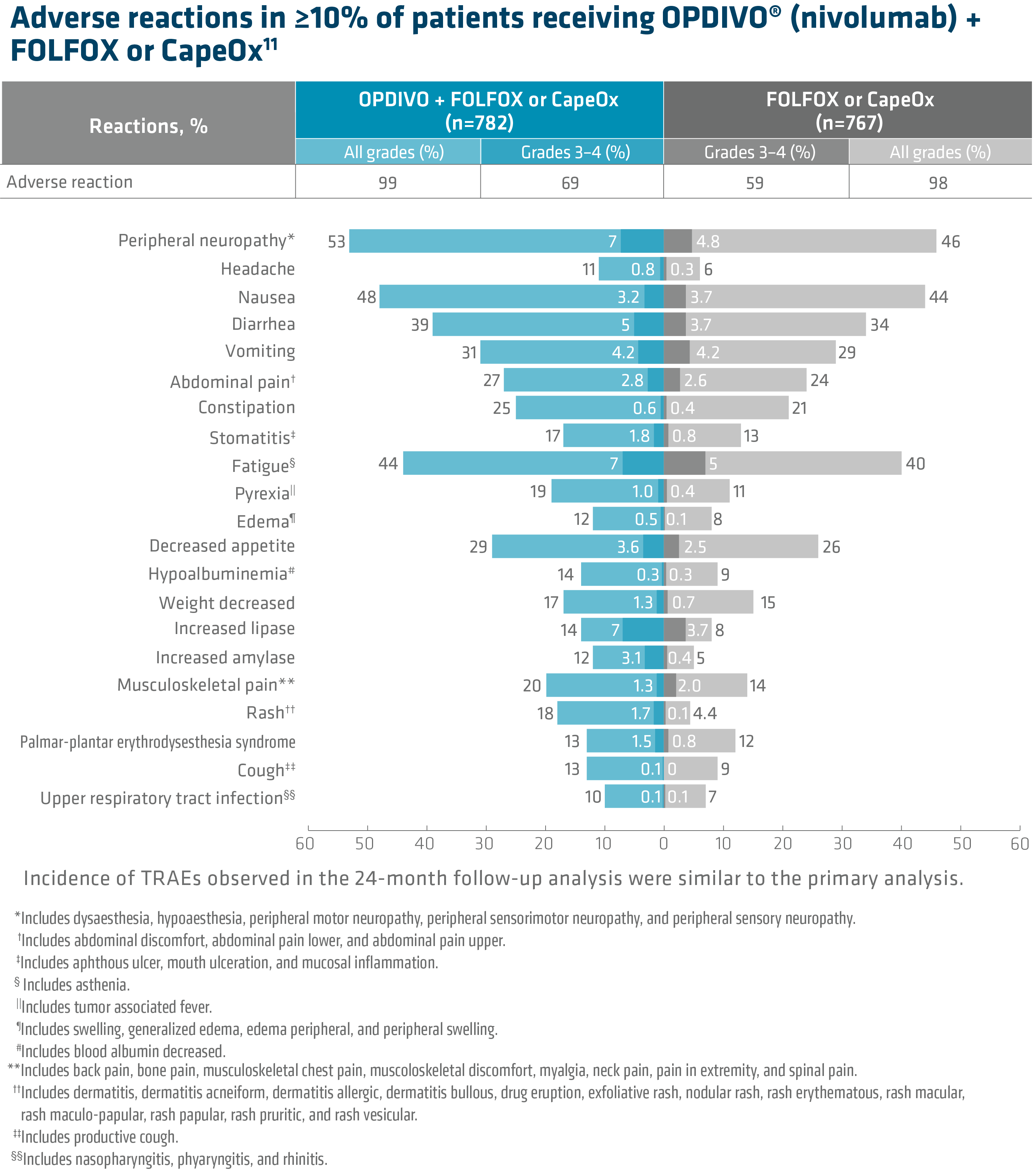 In Checkmate 649, the most common adverse reactions reported in ≥20% of patients treated with OPDIVO in combination with chemotherapy were peripheral neuropathy, nausea, fatigue, diarrhea, vomiting, decreased appetite, abdominal pain, constipation, and musculoskeletal pain. Of the ARs occurring in ≥10% of patients, those which were Grade 3–4 (OPDIVO + chemo vs chemo) were peripheral neuropathy (7% vs 4.8%), headache (0.8 vs 0.3%), nausea (3.2% vs 3.7%), diarrhea (5% vs 3.7%), vomiting (4.2% vs 4.2%), abdominal pain (2.8% vs 2.6%), constipation (0.6% vs 0.4%), stomatitis (1.8% vs 0.8%), fatigue (7% vs 5%), pyrexia (1% vs 0.4%), edema (0.5% vs 0.1%), decreased appetite (3.6% vs 2.5%), hypoalbuminemia (0.3% vs 0.3%), weight decreased (1.3% vs 0.7%), increased lipase (7% vs 3.7%), increased amylase (3.1% vs 0.4%), musculoskeletal pain (1.3% vs 2%), rash (1.7% vs 0.1%), palmar-plantar erythrodysesthesia syndrome (1.5% vs 0.8%), cough (0.1% vs 0%) and upper respiratory tract infection (0.1% vs 0.1%).