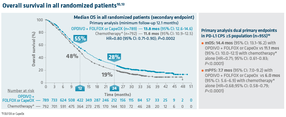 Durable survival data was observed for this OPDIVO-based regimen vs chemotherapy alone in GC/GEJC/EAC. The follow-up analysis at 48.1 months reported a mOS of 13.7 mos (95% CI: 12.4–14.5) with OPDIVO + chemotherapy vs 11.6 mos (95% CI: 10.9–12.5) with chemotherapy in all randomized patients (HR=0.79; 95% CI: 0.71–0.88), and 14.4 mos (95% CI: 13.1–16.2) with OPDIVO + chemotherapy vs 11.1 mos (95% CI: 10.1–12.1) with chemotherapy in patients with PD-L1 CPS ≥5 (HR=0.70; 95% CI: 0.61–0.81). The 48-month OS rate was 13% vs 8% for OPDIVO + chemotherapy vs chemotherapy, respectively, in all randomized patients.2