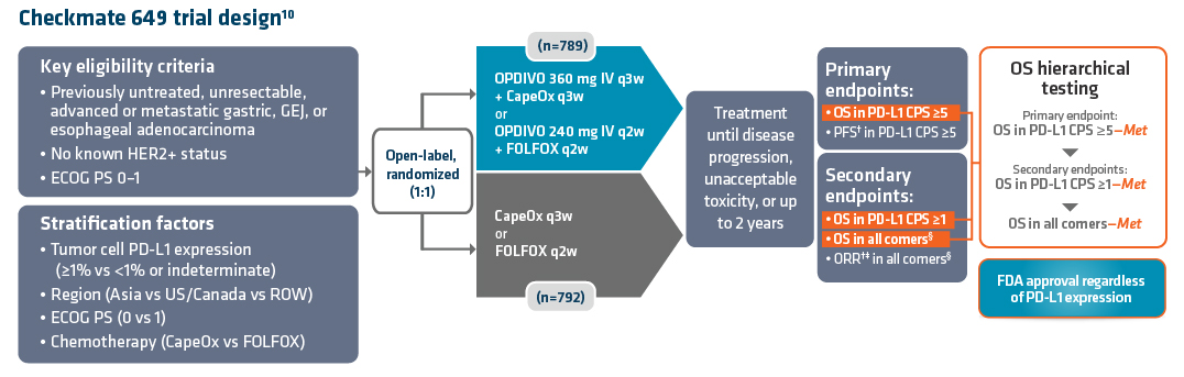 Trial-DesignCheckmate 649 enrolled 1581 patients randomized 1:1 to receive either OPDIVO + chemotherapy (n=789) or chemotherapy alone (n=792). The dual primary endpoints were OS and PFS in PD-L1 CPS ≥5. OS in PD-L1 CPS ≥1 and in all-comers were secondary endpoints, but were powered to measure statistical significance through hierarchical analysis. Baseline characteristics were consistent among all randomized patients and patients with PD-L1 CPS ≥5. Checkmate 649 was the first phase 3 trial to achieve positive results in the evaluation of a PD-1 inhibitor in combination with FOLFOX or CapeOx, allowing for synchronized I-O dosing options with the preferred chemotherapy.8