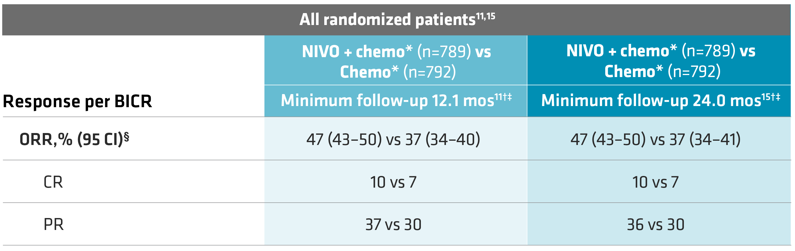 A secondary endpoint (min follow-up of 12.1 mos), ORR in all randomized patients, was 47% (95% CI: 43–50) with OPDIVO + chemo vs 37% (95% CI: 34–40) with chemo alone. Complete response (CR) rates were 10% vs 7% and partial response (PR) rates were 37% vs 30% for OPDIVO + chemo vs chemo, respectively.11