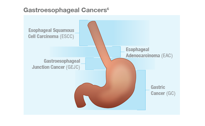 Gastric and esophageal cancers can be aggressive diseases with 5-year relative survival rates of <6% in the metastatic setting in the United States.7,8 Worldwide, GC and EC represent the fourth and sixth most common causes of cancer-related deaths, respectively.5