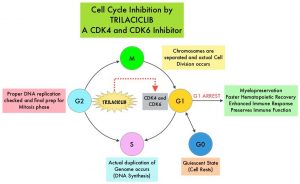 Trilaciclib is a highly potent, selective, and reversible, intravenous, Cyclin-Dependent Kinase 4 and 6 (CDK 4/6) inhibitor, that transiently maintains G1 cell cycle arrest of Hematopoietic Stem and Progenitor Cells (HSPC), and protects them from damage by cytotoxic chemotherapy. Chemotherapy-induced damage of Hematopoietic Stem and Progenitor Cells (HSPC) causes multi-lineage myelosuppression. Trilaciclib proactively preserves HSPC and immune system function during chemotherapy (myelopreservation). Preclinical studies have demonstrated that Trilaciclib transiently maintains HSPC in G1 arrest and protects them from chemotherapy damage, leading to faster hematopoietic recovery. Additionally, Trilaciclib enhances immune response, and preserves immune system function.