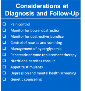 Once a patient begins treatment, close monitoring of the patient for evidence of disease progression is very important in order to offer patients second line chemotherapy. Thus, evaluation of the patient’s clinical status, restaging scans, and CA19-9 in a timely fashion will help guide the clinician on starting second line therapy.7,3 For patients with tumors that have a mutation in BRCA 1 or 2 gene (~7% of patients) maintenance with a PARP inhibitor, after receiving chemotherapy is recommended. Additional targeted agents are a possible treatment option if the tumors have presence of specific mutations.3,7